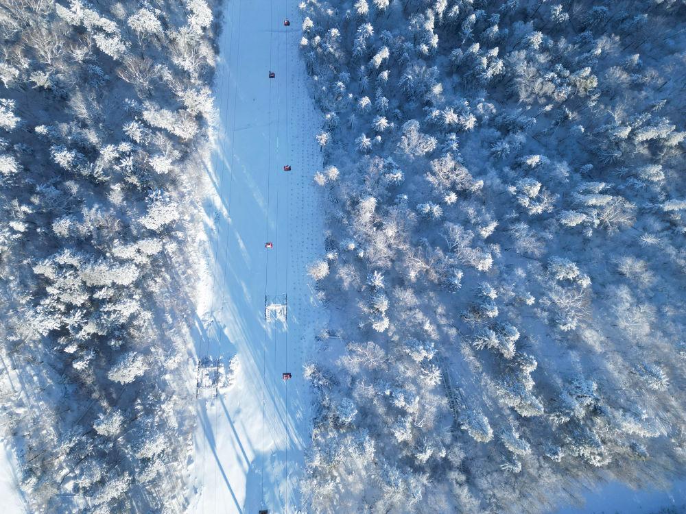 ↑这是12月2日在吉林市北大湖滑雪度假区拍摄的由北京起重运输机械设计研究院和徐州天马索道缆车设备有限公司共同研发生产的缆车(无人机照片)。据介绍,北大湖滑雪度假区的缆车国产化达90%以上。新华社记者 颜麟蕴 摄