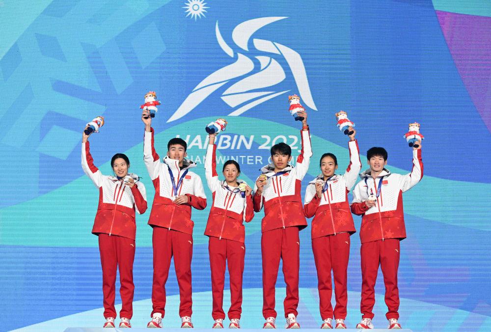 ↑2月9日,中国队选手范可新(前)在第九届亚冬会短道速滑女子3000米接力颁奖仪式上拍照留念。新华社记者 江汉 摄