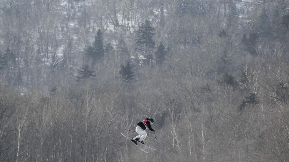 ↑2月11日,中国选手韩林杉在第九届亚冬会自由式滑雪女子坡面障碍技巧决赛中。最终,她获得季军。新华社记者 牟宇 摄