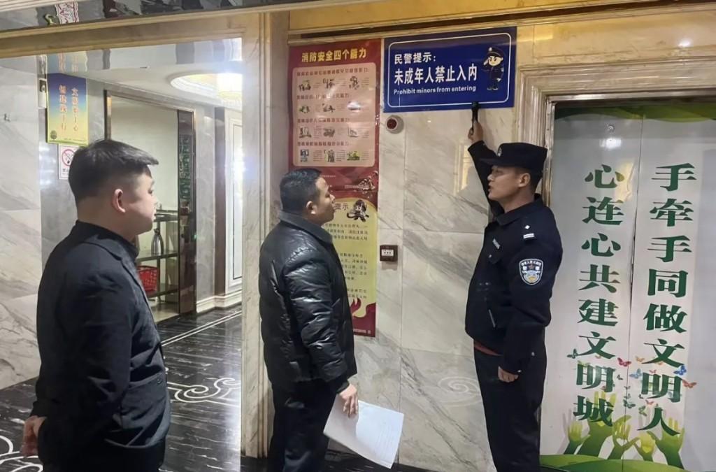 为确保各项保护措施落地见效,堵塞管理漏洞,城关派出所将明察暗访与突击检查相结合,常态化开展重点行业场所夜间清查行动,持续加大对旅馆、酒店、网吧、KTV 等场所的监管力度。严格核查酒店未成年人入住“五必须”落实情况及相关台账,仔细抽查网吧、KTV 等场所“未成年人禁止入内”标识张贴情况和消费者身份信息,全面排查违规接纳未成年人等违法行为。通过高频次、强力度的整治行动,进一步压实了经营者的主体责任,确保相关法律法规和监管要求真正落到实处,有效净化了未成年人成长的社会环境。