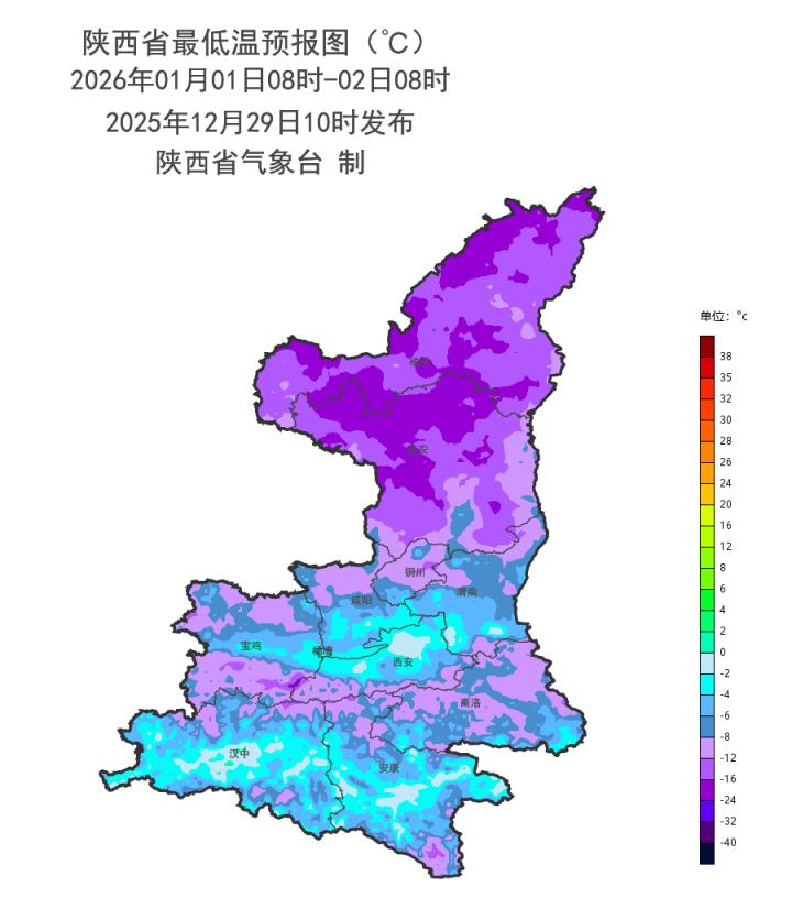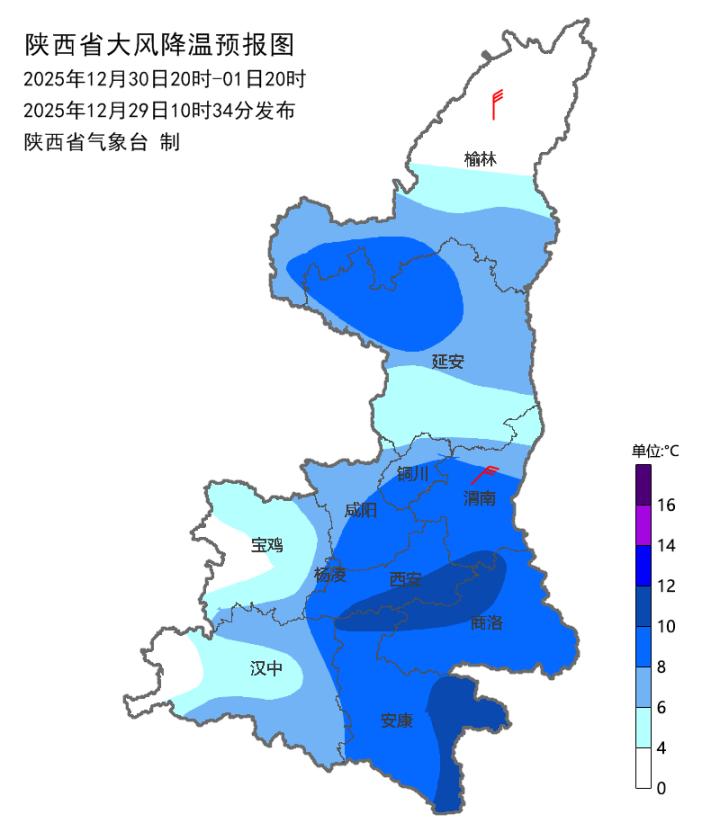 大风降温预报:2025年12月30日-2026年1月1日过程日平均气温全省大部下降4℃~6℃,陕北中南部、关中北部和东部、陕南东部、秦巴山区下降6℃~8℃,局地8℃~10℃,过程期间全省大部地区平均风力4级。预计最低气温出现在2日清晨,陕北、关中北部、秦巴山区-16℃至-8℃,关中南部-6℃至-2℃,陕南-7℃至-1℃。
