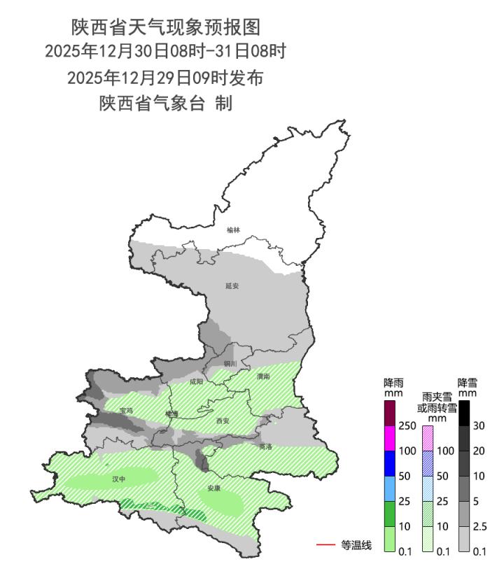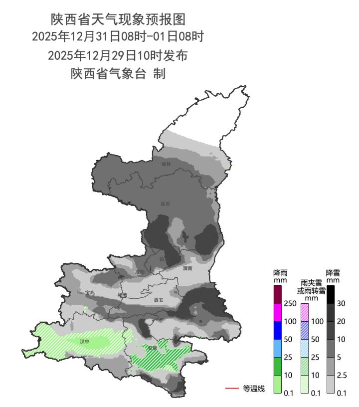 逐日具体预报如下:2025年12月30日:陕北南部、巴山南部局地有小雪(0毫米~2毫米),关中北部、秦岭山区有小到中雪(3毫米~5毫米),关中南部、陕南有小雨或雨夹雪(1毫米~6毫米)。