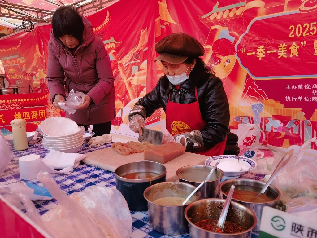本次活动紧扣华阴特色文化,围绕“纳华山瑞气 飨四海团圆”主题,旨在促进当地旅游业和餐饮业的发展,助力该市经济实现高质量发展。活动现场,整齐排列的摊位前炊烟袅袅,摊主们娴熟地演示规范化加工技艺,食客们品尝着一个接一个的美食。
