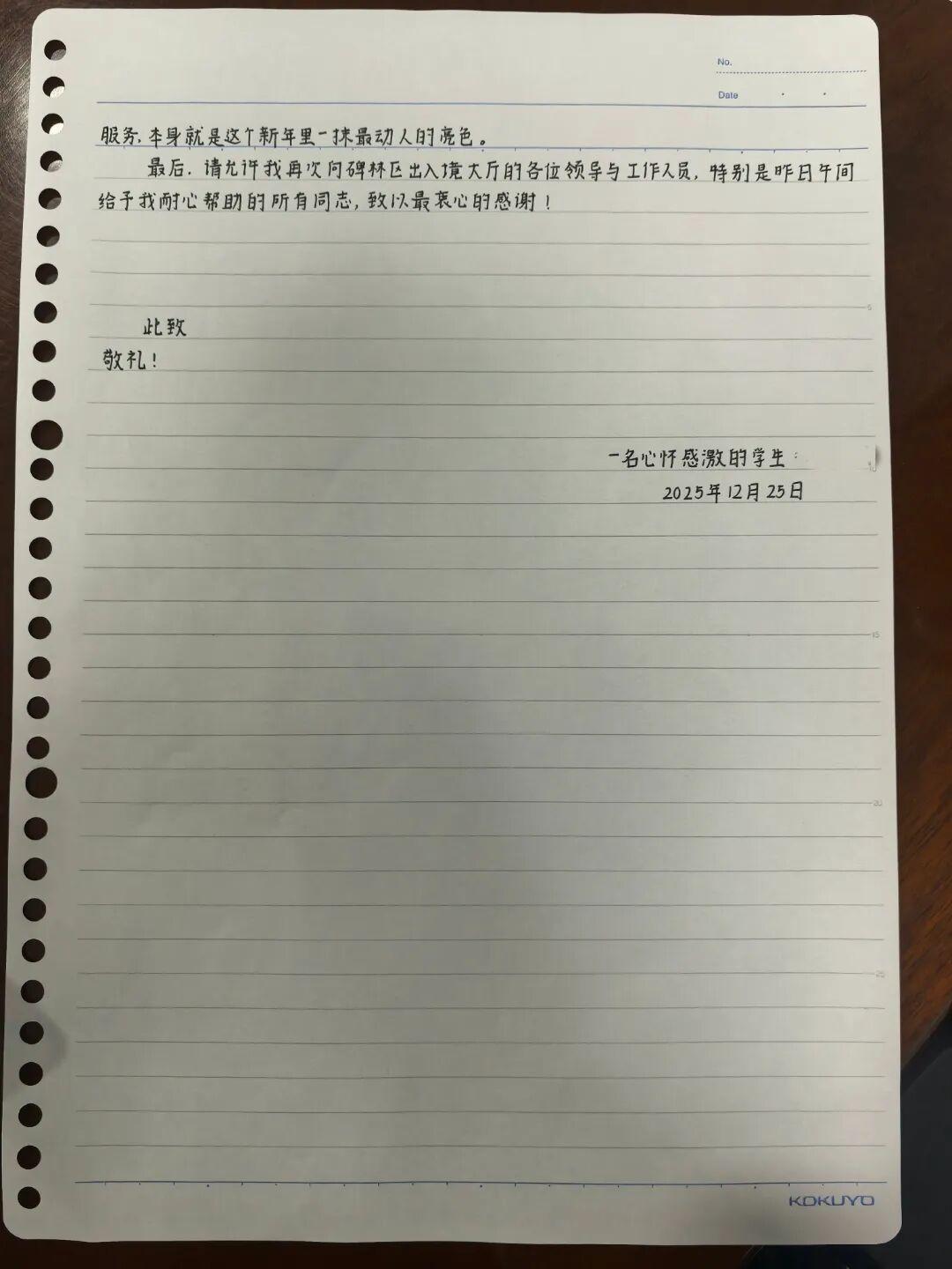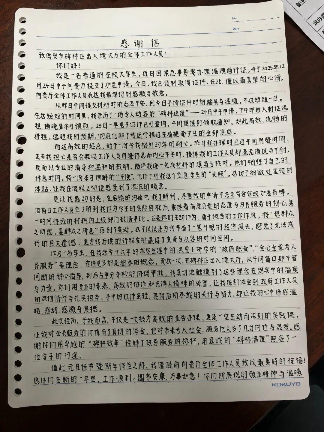 三秦都市报-三秦网讯(记者 葛兰)12月25日,西安市公安局碑林分局出入境接待大厅收到了一份特别的新年“礼物”,一封工整手写、情真意切的感谢信。