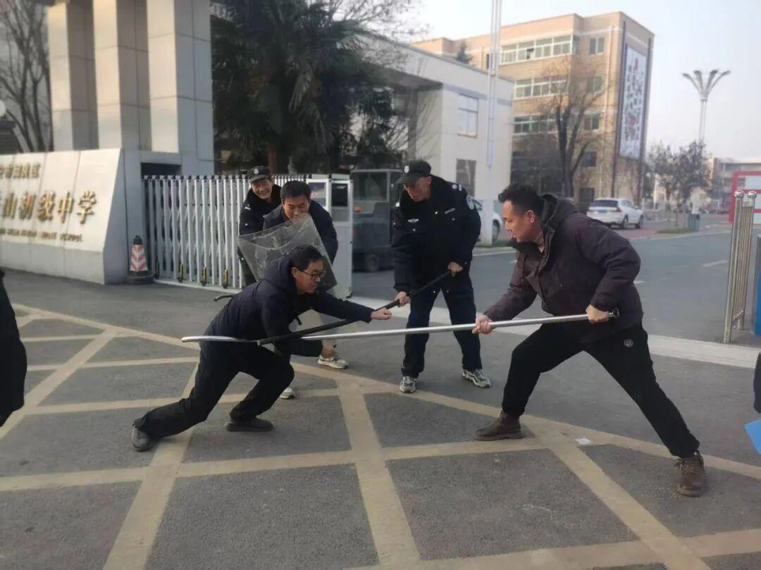 联防联控聚合力,实战演练强本领。近期,分局治安大队、北屯派出所、振兴派出所、关山派出所组织民警辅警走进北屯初中、北屯中心小学、关山初中等学校,以“检查+演练”模式筑牢校园安防网。期间,民警对校园门禁管理、安防器材、监控系统、消防设施开展全维度排查,确保一键报警畅通、制度落地见效;随后,为安保人员与教职工开展防暴器械实操培训,详解钢叉、盾牌等装备的操作要领与协作战术,提升警校联动应急处突能力。