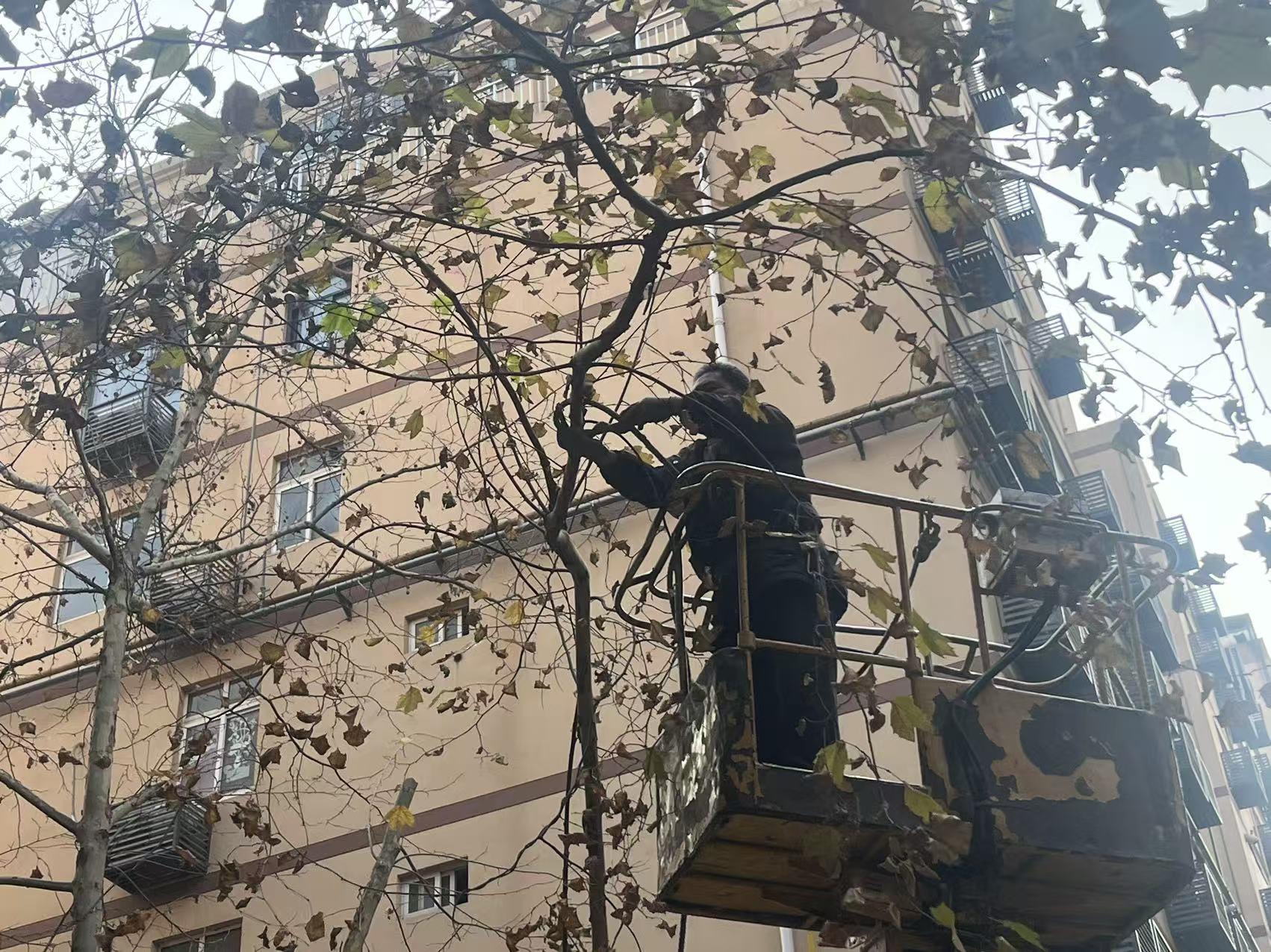 12月29日上午,专业人员在社区与物业工作人员的现场监督与配合下,首先对枯死的核桃树进行了安全砍伐,随后,又利用专业工具对四棵梧桐树过于茂盛及可能影响住户窗户的枝条进行了精心修剪。