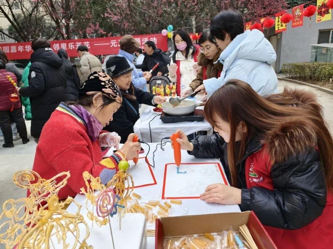 非遗糖画体验区同样热闹,熔化的糖浆在光洁的纸板上挥洒自如,顷刻间,栩栩如生的飞禽走兽、花鸟虫鱼便跃然眼前。这不仅是舌尖上的美食,更是独具韵味的民间艺术。大人小孩围在摊位前,品尝着浓浓的年味,分享着美食带来的喜悦,暖心暖胃更暖情。“这个活动真好呀,一下子让我觉得过年啦,看这是我亲手制作的糖画,我要带回去给我孙子玩。”居民王阿姨笑着说道。