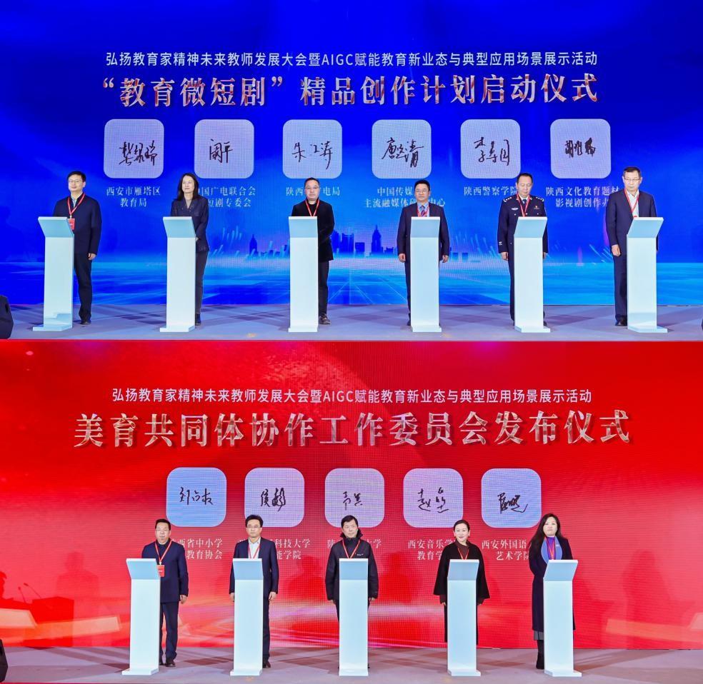 “教育微短剧精品创作计划”由中国广电联合会微短剧专委会、陕西省广电局、中国新闻技术工作者联合会AIGC与数智传播专委会、陕西省中小学影视教育协会、陕西警察学院、西安市雁塔区教育局、陕西翰林教育研究院等单位领导共同启动,以视听技术与创新形态重塑教育叙事模式;“美育共同体协作工作委员会”由陕西师范大学美术学院、西安电子科技大学人工智能学院、西安外国语大学艺术学院、西安音乐学院音乐教育学院等单位共同设立,为构建融合共生的教育生态注入新动能;现场还发布了AIGC赋能教育新业态新应用教育典型案例,西安高新第五小学、西咸新区沣西实验学校作为典型案例代表分享了“家校协同育人”“以体树人”的实践探索。