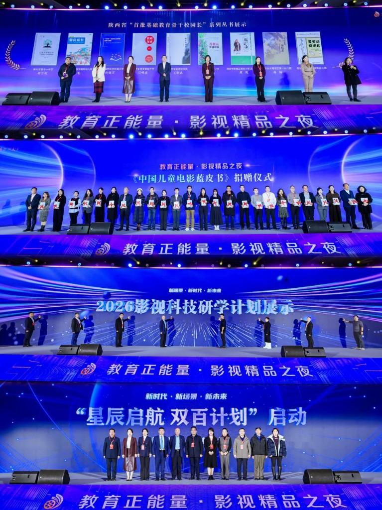 “教育正能量·影视精品之夜”,集中展示年度影视教育成果与美育共同体协作蓝图,《陕西省“首批基础教育骨干校园长”系列丛书》展示;《中国儿童电影蓝皮书》捐赠仪式同步举行;美育共同体协作工作委员会集体展示;现场还发布了2026红色影视科技研学计划并启动“星辰起航 双百计划”;最后公布了2025弘扬教育家精神典型案例。