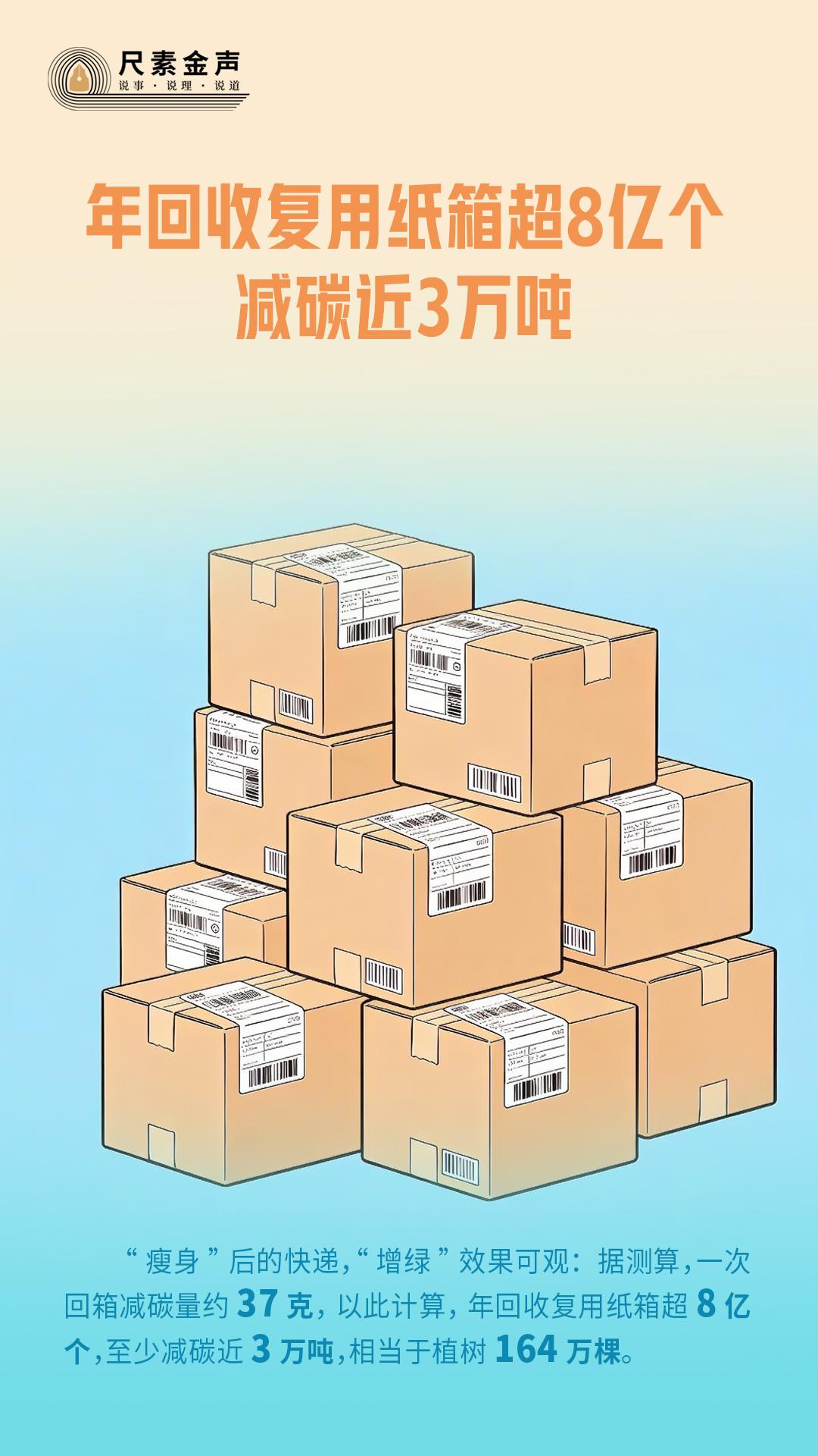 “瘦身”后的快递,“增绿”效果可观:据测算,一次回箱减碳量约37克,以此计算,年回收复用纸箱超8亿个,至少减碳近3万吨,相当于植树164万棵。