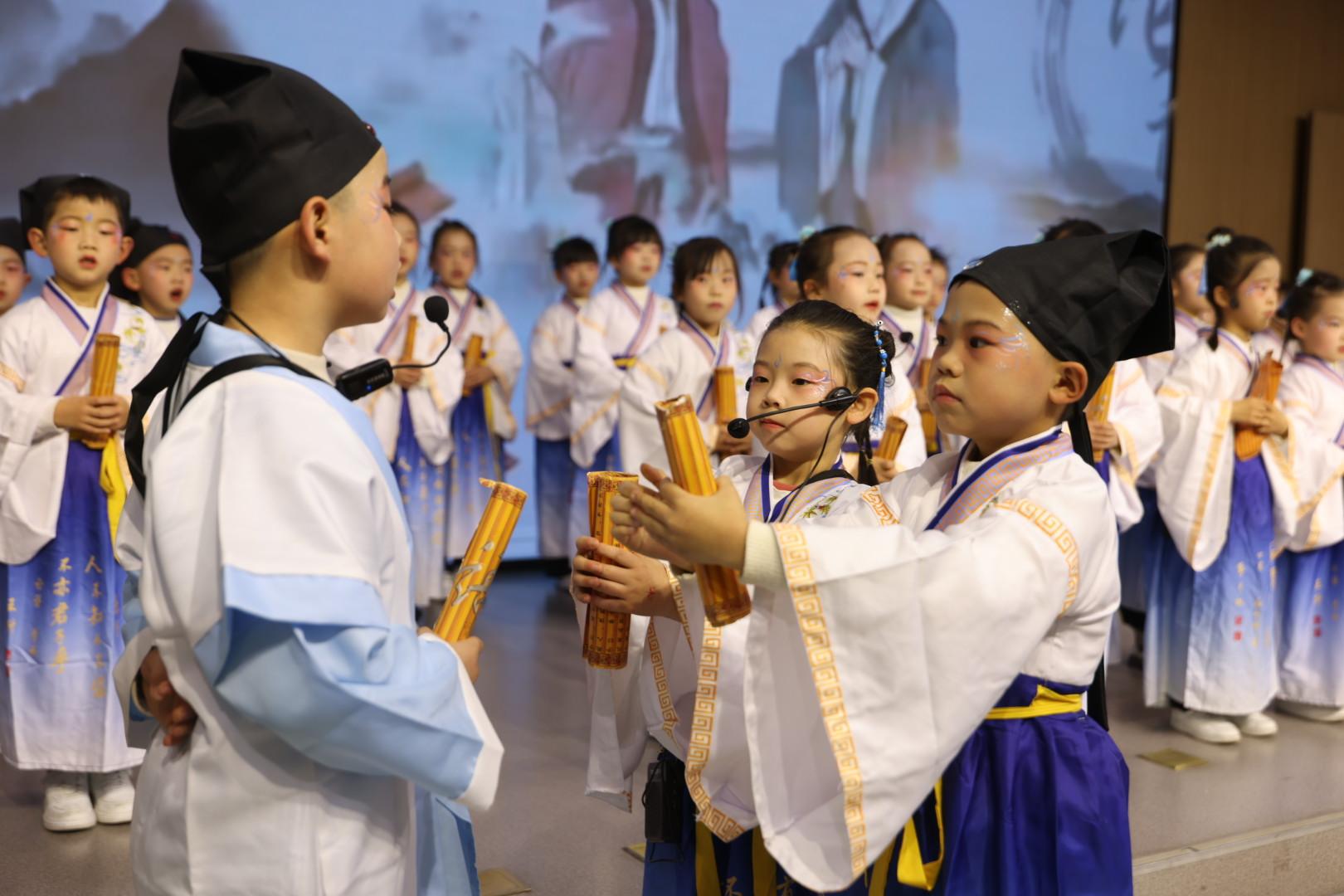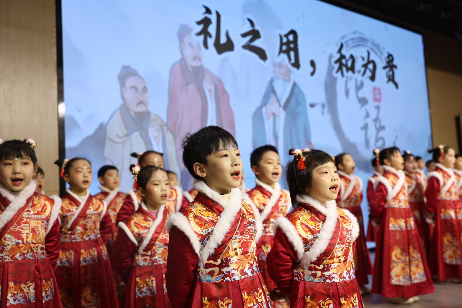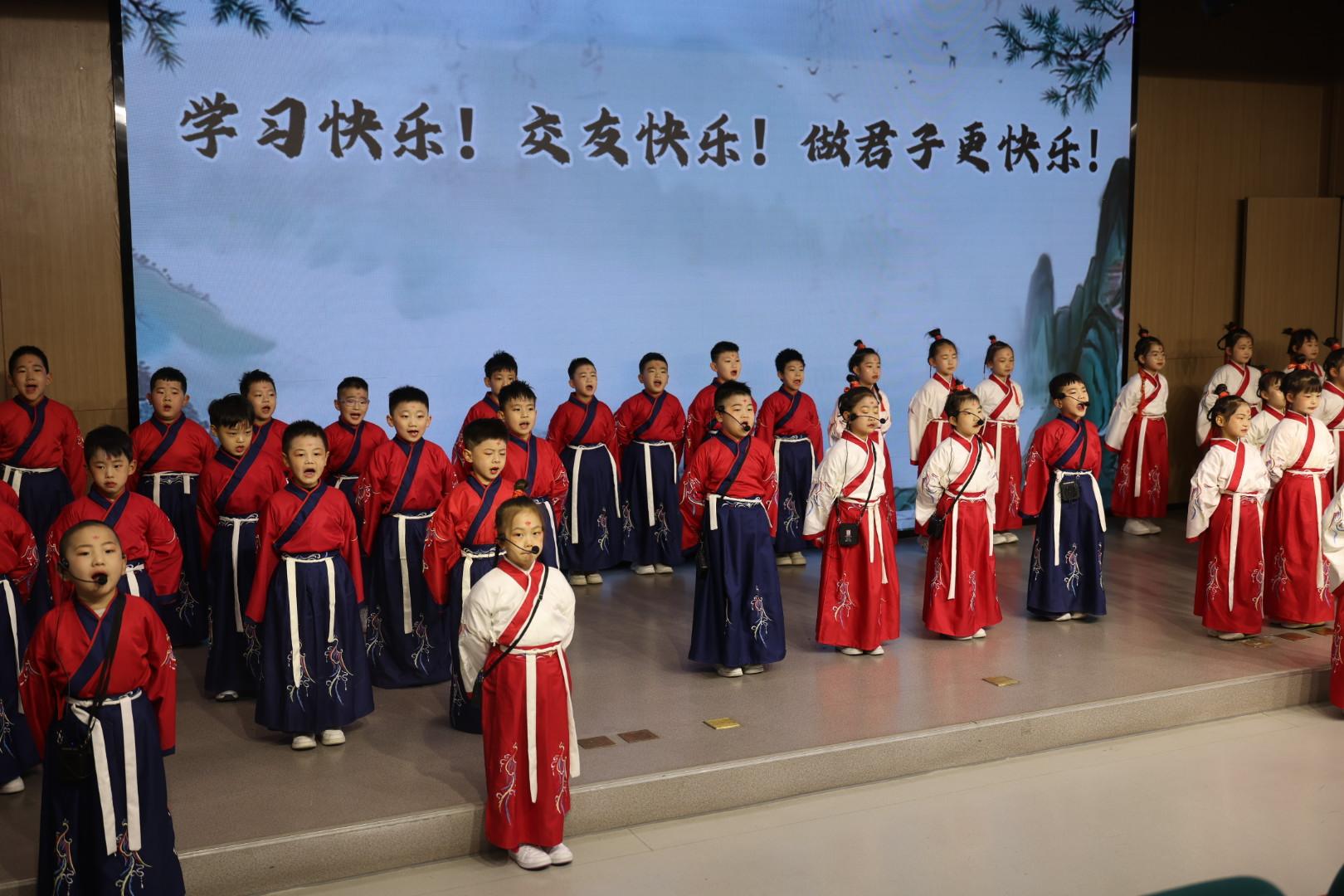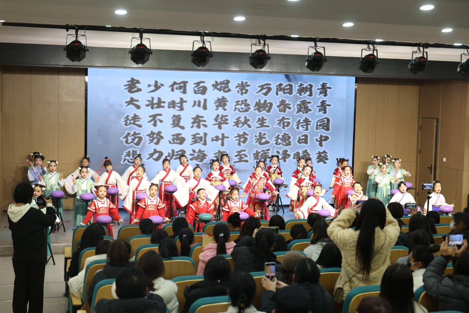 展演在空灵鼓演奏《鼓鸣启学》中拉开帷幕,各班学生依次登台,围绕《论语》展开丰富多彩的演绎。一年级三班带来《仁者安仁,知者利仁》以童声诠释儒家仁爱思想;一年级六班表演的《信近于义,言可复也》体现诚信守诺的优良传统;一年级一班的《学思不辍,修身以敬》传递勤学修身的精神追求。此外,二班、四班、五班也分别通过《温故知新,言而有信》《三省吾身,见贤思齐》《天下归仁,天下大同》等节目,展现了少年学子在经典熏陶下的成长与感悟。