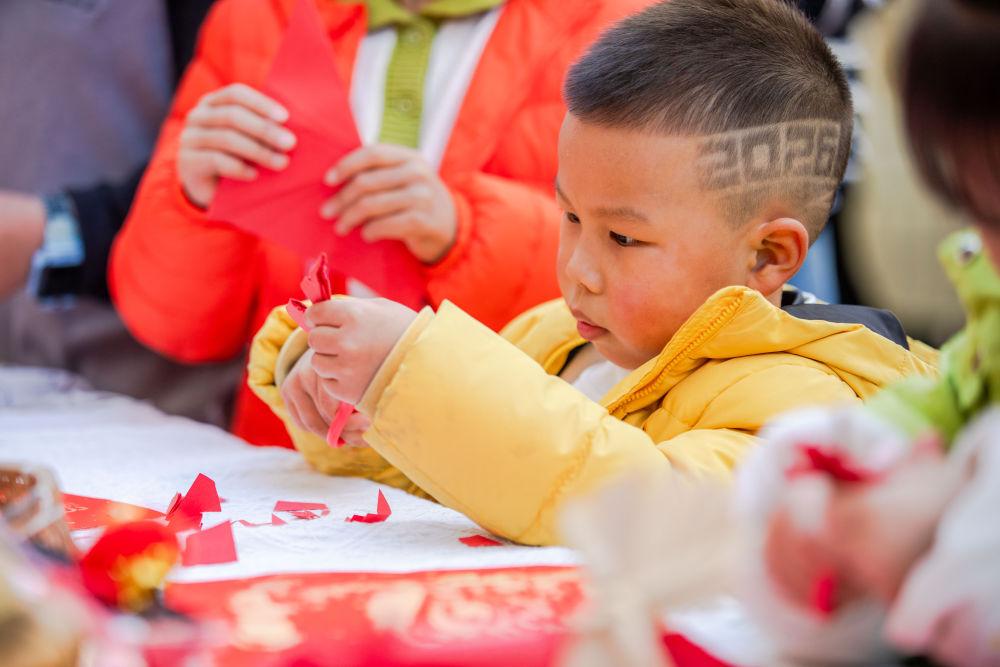 ↑ 12月28日,在浙江省温州市鹿城区双屿街道垟田社区,小朋友在剪窗花。新华社发(刘吉利摄)