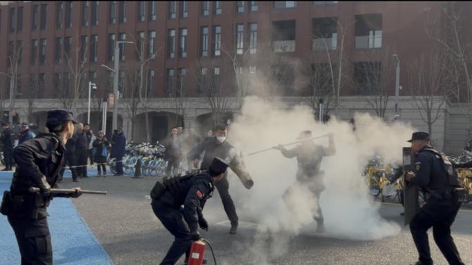 演练以“模拟可疑人员试图闯入校园”为场景,全程紧贴实战、环环相扣,同步结合反恐法颁布10周年宣传要求,强化“依法反恐、全民反恐”的实战导向。校园安保人员发现险情后,第一时间启动应急响应,迅速组建由自有安保力量构成的最小作战单元,手持灭火器、防暴盾牌、钢叉等器械与“可疑人员”形成对峙周旋,同步启动校园“最小平安单元”联动机制,组织网格安保人员引导周边师生沿预定路线有序撤离至安全区域,并通过一键报警系统精准同步警情至警方。接到指令后,派出所、反恐怖与特警大队队员快速抵达现场,与校园最小作战单元无缝衔接、协同处置,运用专业战术形成合围,迅速完成“可疑人员”制服控制。此次演练既检验了高校最小作战单元的初期处置能力和“最小平安单元”的联动效能,强化了校警协同作战机制,更以实战场景呼应反恐法“强化重点场所安全防护”的要求,筑牢校园应急防护第一道防线。