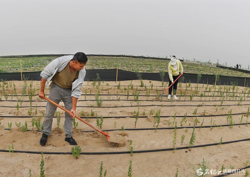 在民丰县后河坝沙漠阻击区的防沙治沙试验站,工人在沙漠里进行桔梗补植、管护等田间作业(6月15日摄)。石榴云/新疆日报记者约提克尔·尼加提摄