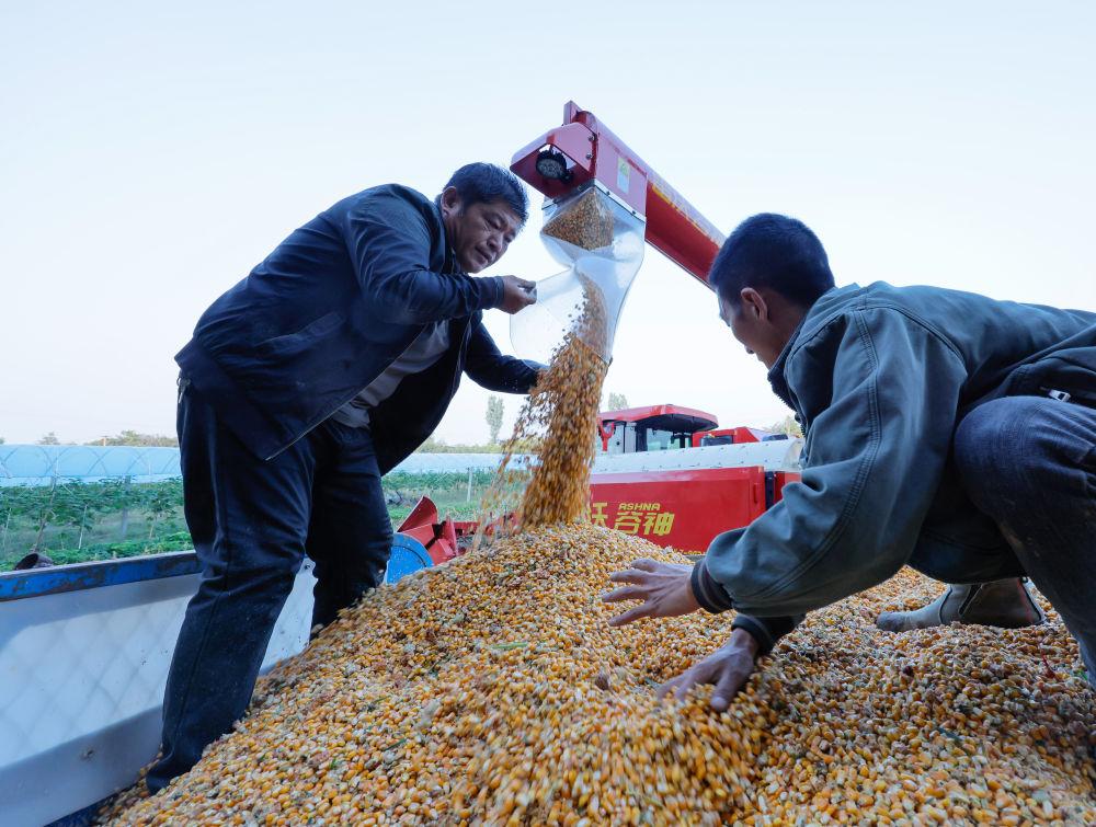 10月13日,山西省运城市万荣县里望乡村民趁着晴好天气抢收玉米。
