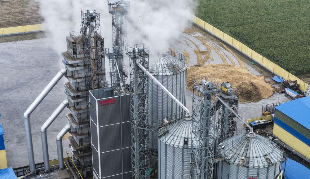 10月11日,在山东省东营市广饶县李鹊镇一处粮食收储企业,大型烘干设备在烘干秋粮。