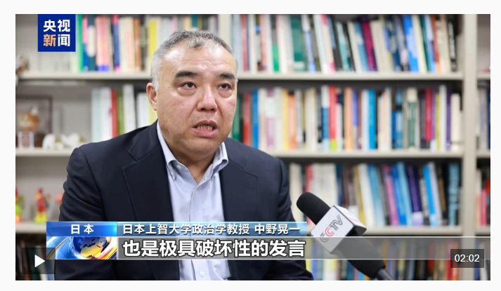 日本上智大学政治学教授中野晃一近日在接受总台记者采访时指出,高市早苗有关对华立场的言论将进一步破坏日中关系,并反噬日本自身的经济与社会稳定。