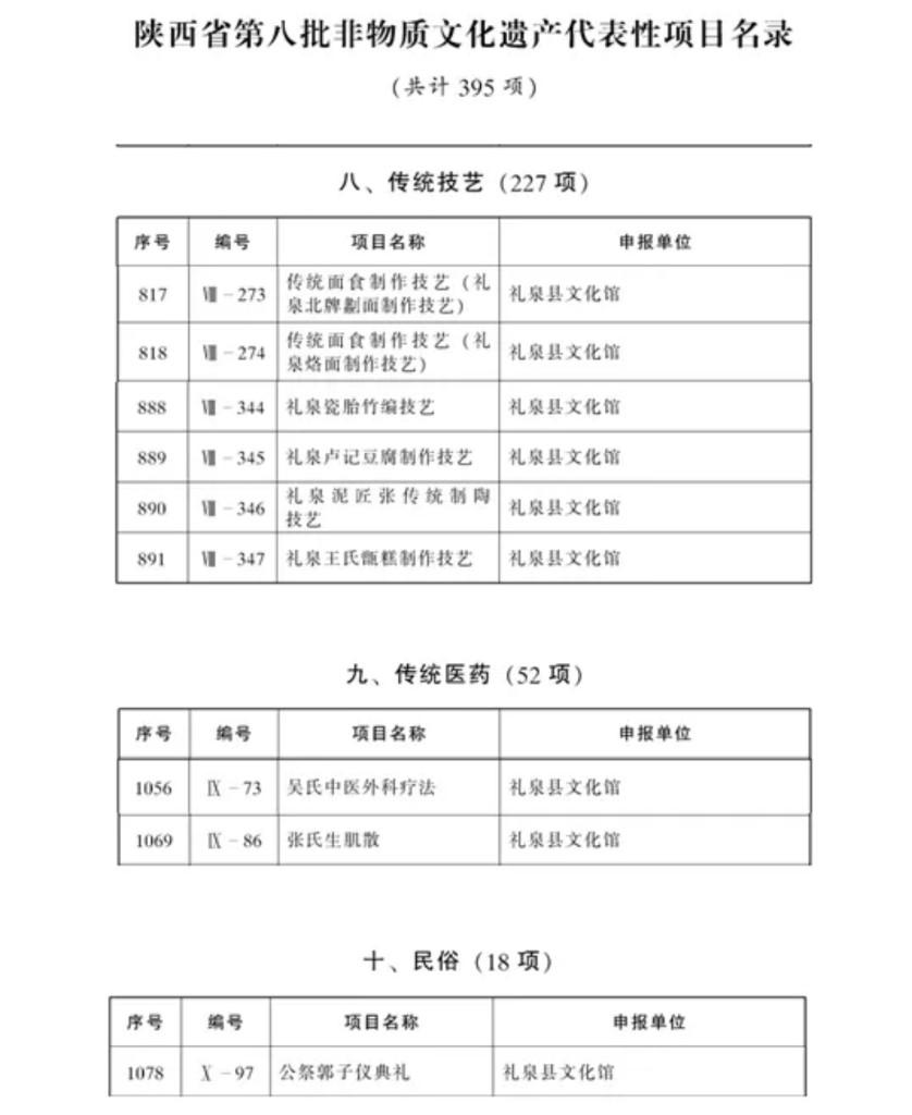 此次入选的项目分别为:传统面食制作技艺(礼泉北牌劙面制作技艺)、传统面食制作技艺(礼泉烙面制作技艺)、礼泉瓷胎竹编技艺、礼泉卢记豆腐制作技艺、礼泉泥匠张传统制陶技艺、礼泉王氏甑糕制作技艺、吴氏中医外科疗法、张氏生肌散、公祭郭子仪典礼。这些项目各具特色、底蕴深厚,既是礼泉本土文化的珍贵积淀,也承载着关中地域的文化根脉与匠心智慧。