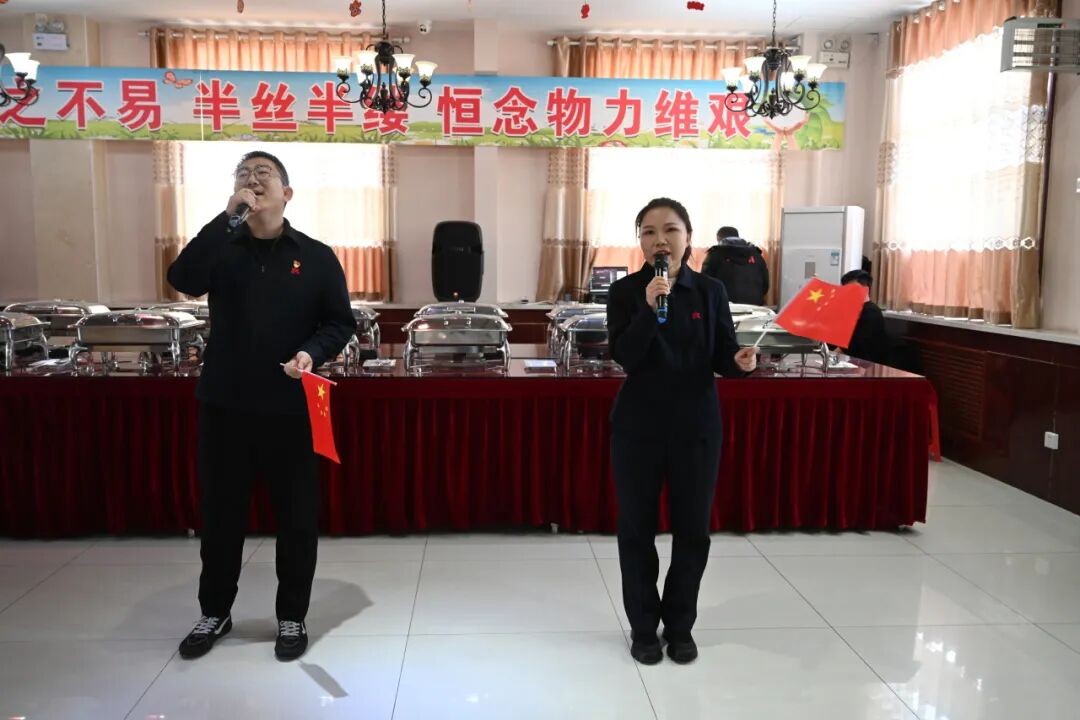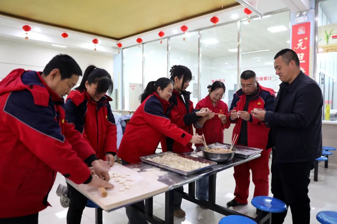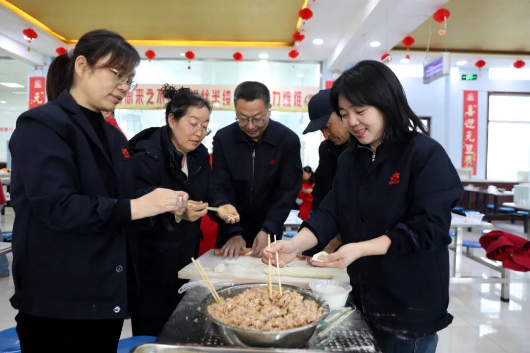 中午时分,“同心暖冬,饺子团圆会”温馨开场。厂领导、退休老同志与在职干部职工欢聚一堂,围坐在一起揉面、擀皮、包饺子,话家常、聊发展、共叙情谊。厨房里热气蒸腾,佳肴纷呈——香甜的蛋糕、热气腾腾的炖羊肉、精心烹制的排骨、琳琅的水果饮料等,处处传递着组织的深切关怀。席间,厂领导逐桌送上温暖的新年祝福。此刻,浓厚的“家”文化暖意升腾,深深驱散了冬日的严寒。