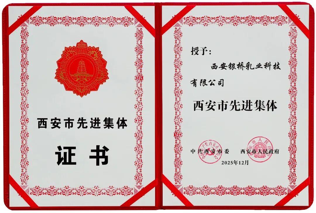 作为陕西省和西安市乳制品产业链双“链主”企业,银桥充分发挥龙头带动作用,积极实施“三品”战略,推动全产业链提质升级。2024年10月,银桥再次被农业农村部认定为“农业产业化国家重点龙头企业”;2025年4月,荣获西安市工业和信息化局“先进企业”称号;同年,被市委市政府授予“西安市民营经济高质量发展突出贡献企业”称号。