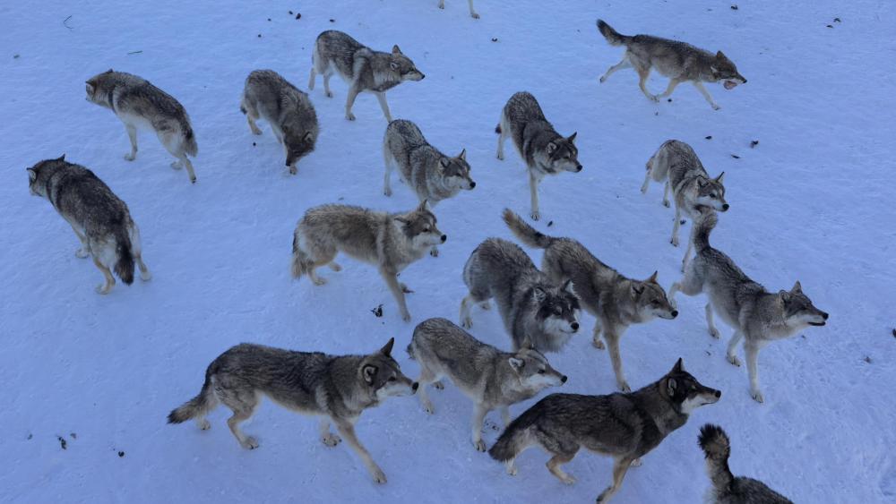 12月25日,青格里狼山国际滑雪场旁西北狼园里的狼群在等待游客投喂。新华社记者 王立明 摄