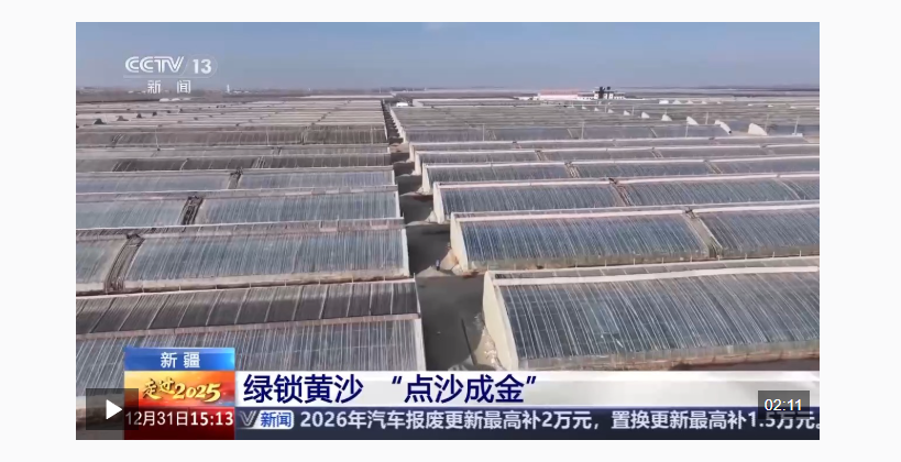 总台记者卜鹏:这里是位于塔克拉玛干沙漠边缘的新疆和田地区和田县万亩设施农业基地,一座座标准化的大棚整齐排列,现在正值大棚果蔬采摘的季节,当地依托现代化农业管理技术,让曾经的万亩沙海变成助农增收的绿色基地。