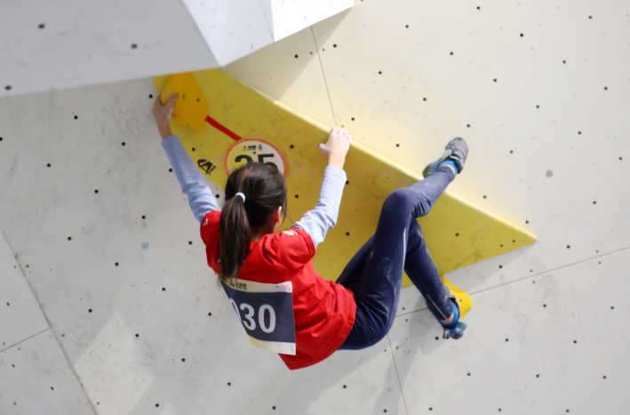 U11男子组的比拼同样扣人心弦。选手朱浩泽迎战一条公认的高难度赛道,这条线路对指力与动态爆发力的结合度要求极高。行至难点处,他微微屈膝蓄力,身体如蓄势待发的弹簧骤然舒展,右手精准锁定远端岩点,整套动作一气呵成,顺势向上攀登。