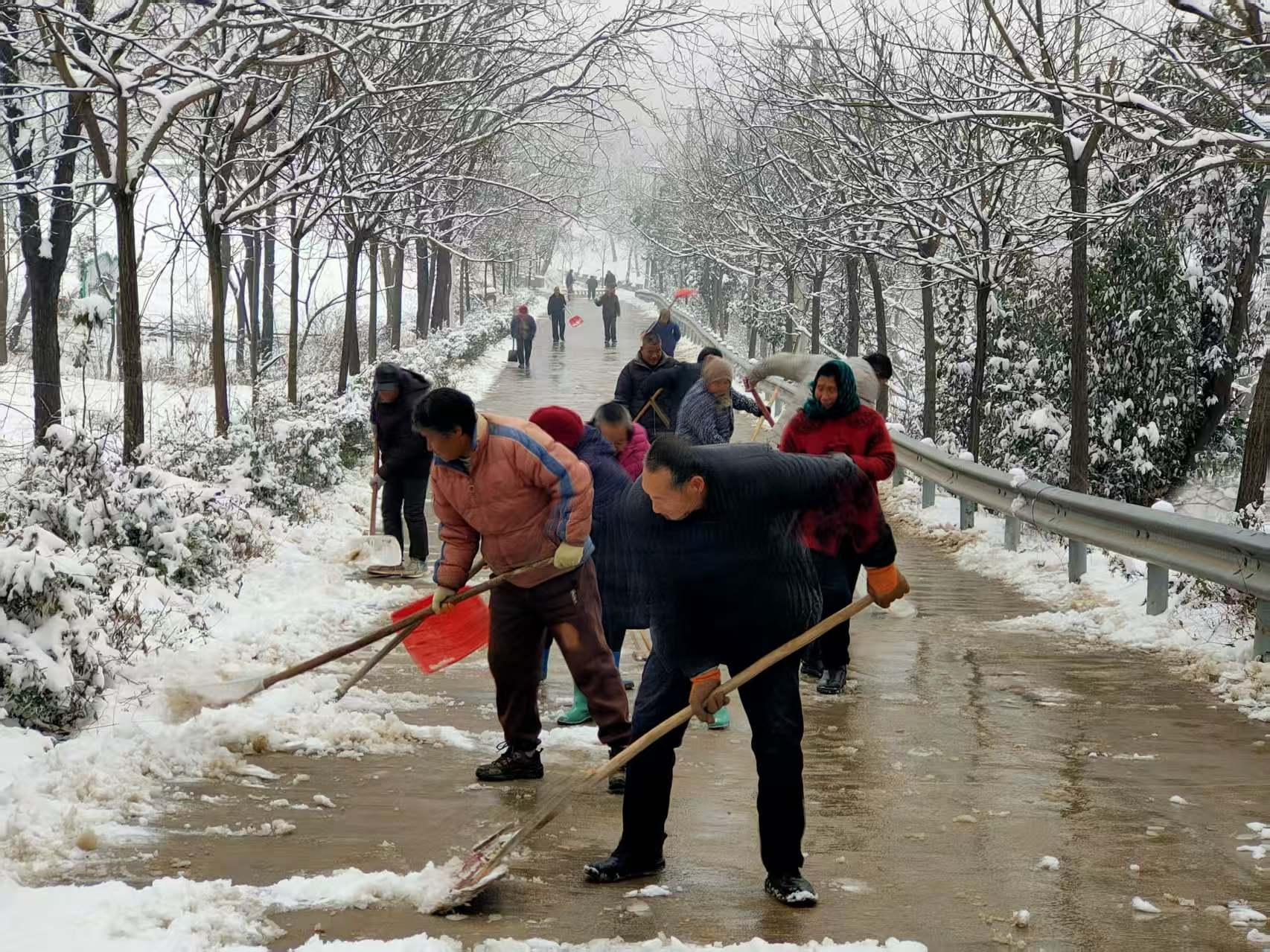 清雪现场,大家手持铁锹、扫帚、雪推板等工具,按照“分区作业、重点清理”的原则,对辖区主干道、村组路口等重点路段的积雪和薄冰进行集中清理。有人挥锹铲雪、有人用板推雪、有人拿扫帚扫尾,分工协作、配合默契。