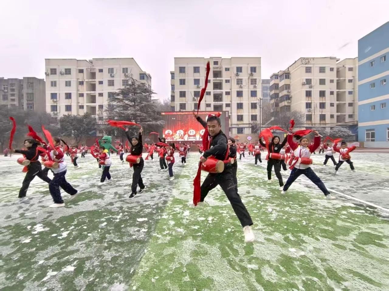 与此同时,教职工迎新活动在操场温情启幕。漫天飞雪中,腰鼓队以一场《鼓舞欢歌开门红》拉开序幕,激昂的表演点燃全场热情。薛晓娜老师的独唱《春风十万里》用悠扬歌声传递出对新一年的期许。吴少聪老师的萨克斯演奏婉转深情,为冬日校园增添诗意。周洁、薛璐老师与教职工子女的口风琴合奏《过新年》充满温馨。体育组教师在积雪的操场上表演的啦啦操《操场主理人》将活动气氛推向高潮。