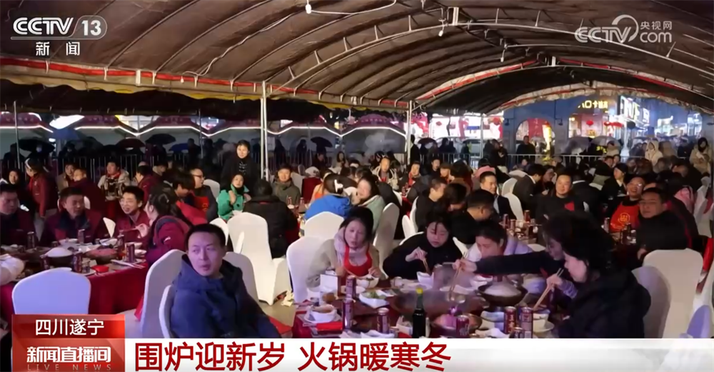 庆元旦、吃火锅、迎新年。2025年12月31日晚,在四川遂宁市安居区,火锅美食节热闹举行,大家齐聚一堂,一边品尝麻辣鲜香的特色火锅,一边欣赏精彩的文艺演出。