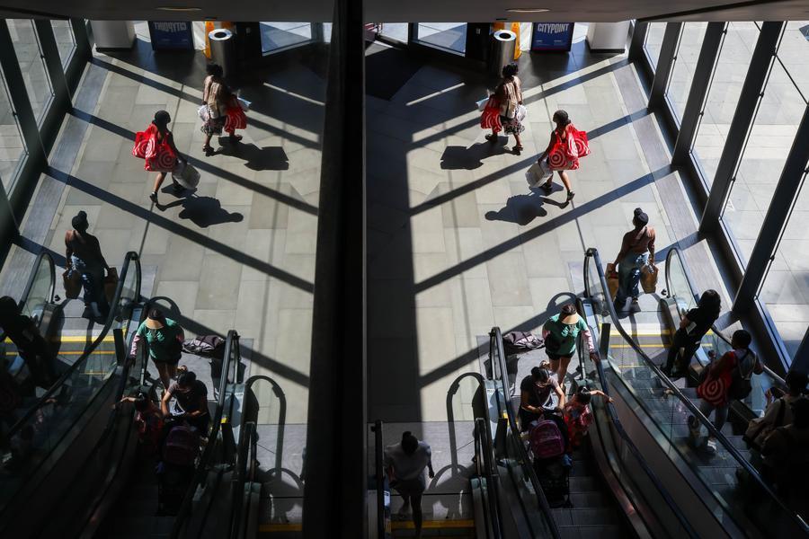 People walk in and out a retail store in New York, the United States, on Aug. 12, 2025. (Photo by Michael Nagle/Xinhua)