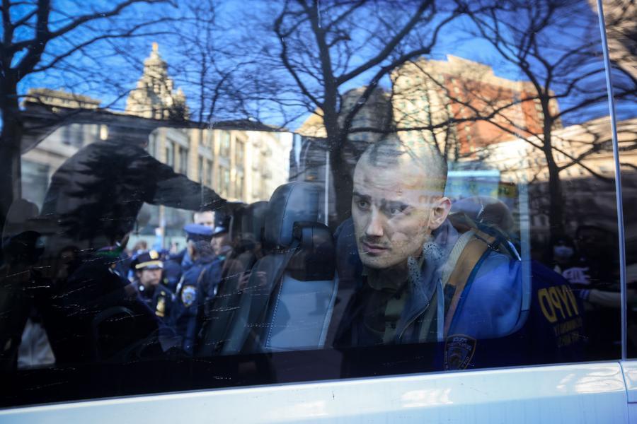 An arrested demonstrator sits in a New York Police Department (NYPD) van during a protest against the Donald Trump administration's policies on the Middle East, campus protests and immigration in New York City, the United States, March 11, 2025. (Photo by Michael Nagle/Xinhua)