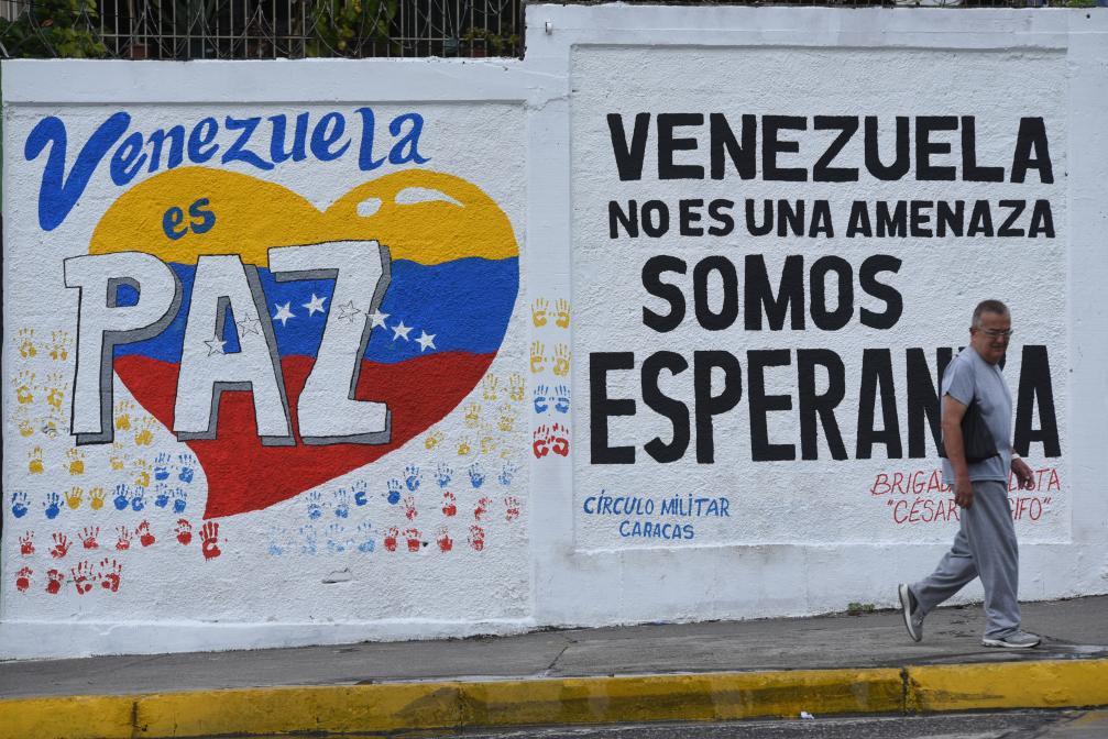 2025年9月22日,在委内瑞拉首都加拉加斯,行人从街头的宣传标语前走过。标语上写着“委内瑞拉是和平国度”“委内瑞拉不是威胁,而是希望”。新华社发(马科斯·萨尔加多摄)