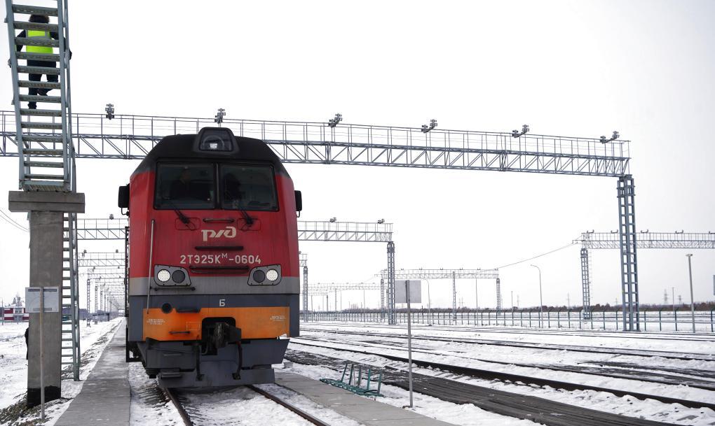 2025年12月6日,一辆即将开往中国的俄罗斯货运列车停靠在俄罗斯下列宁斯阔耶铁路口岸。新华社记者刘恺摄