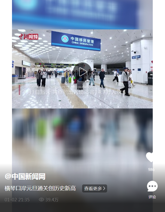 2026年元旦假期首日,横琴口岸迎来跨境“开门红”。据珠海边检总站横琴边检站统计,1月1日当天,共查验出入境旅客14.7万人次,创下该口岸单日客流历史新高,较去年同比增长84%。其中,赴澳旅游的内地旅客超10万人次,占当天客流总量的71%。同时,查验出入境车辆超1.1万辆次,其中单牌车数量超7000辆次,占比约63%。