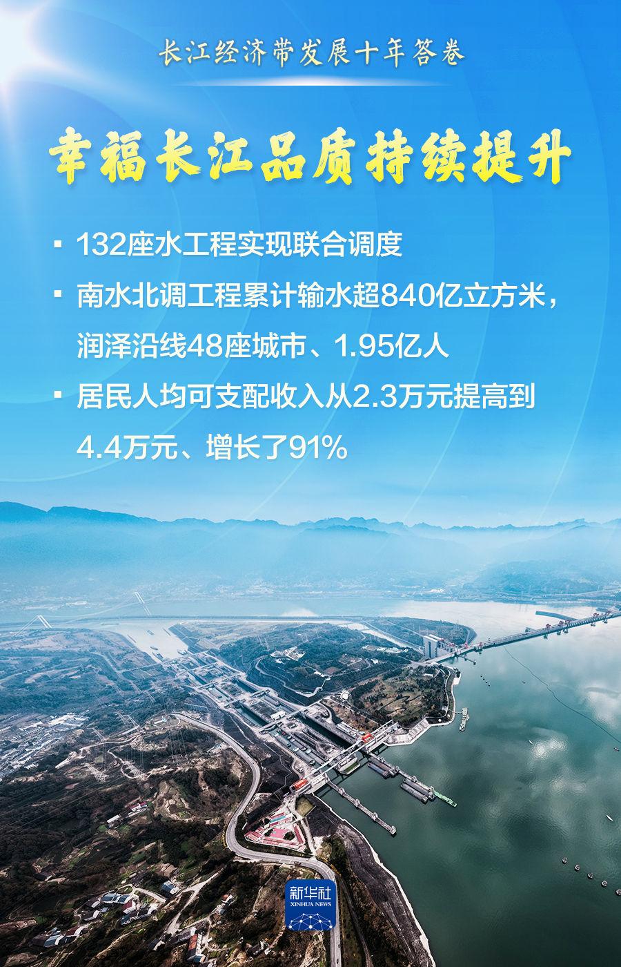 长江经济带发展是我国区域重大战略。十年来,长江经济带共抓大保护、不搞大开发,优良水质比例从67%提升到96.5%;地区生产总值翻了一番多、占全国比重提升到47.3%;形成了汽车制造、电子信息等一批世界级产业集群……保护和发展的相互促进、相得益彰,书写了人与自然和谐共生的中国式现代化时代篇章。