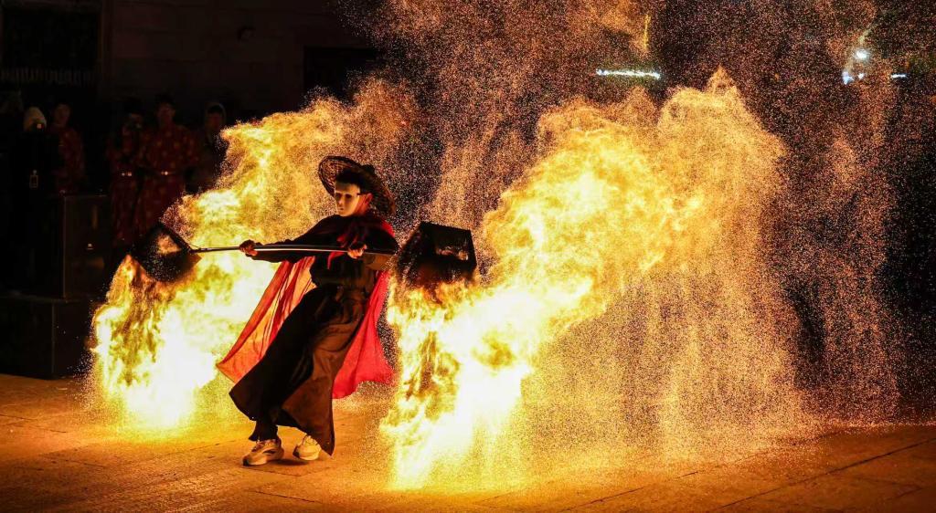 火壶表演者手持特制铁壶娴熟抖动,滚烫的火星四溅升腾;“吐火”表演紧随其后,火光从表演者口中喷薄而出;在充满童趣与喜庆的盒子灯表演中,造型别致的花灯次第“绽放”;非遗鱼灯巡游环节,队伍循着街巷缓缓穿梭,鱼灯摇曳,尽显古韵浪漫。