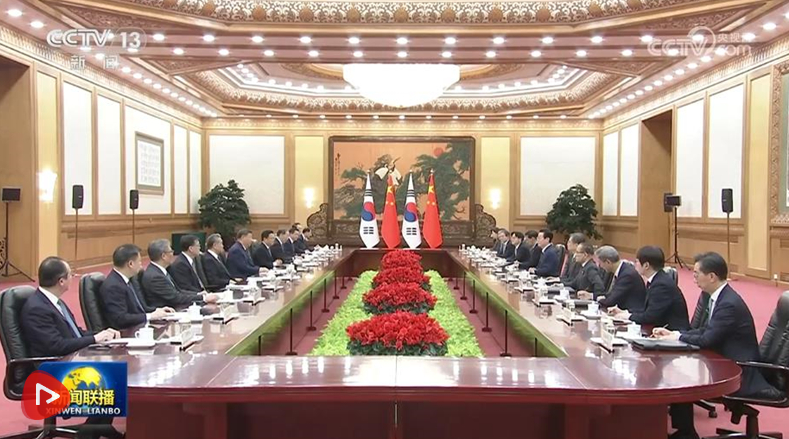 习近平指出,当前世界百年变局加速演进,国际形势更加变乱交织。中韩在维护地区和平、促进全球发展方面肩负重要责任,有广泛利益交集,应当坚定站在历史正确一边,作出正确战略选择。80多年前,中韩两国付出巨大民族牺牲,赢得抗击日本军国主义的胜利。今天更应携手捍卫二战胜利成果,守护东北亚和平稳定。作为经济全球化的受益者,中韩要共同反对保护主义,践行真正的多边主义,为推进平等有序的世界多极化、普惠包容的经济全球化作出贡献。