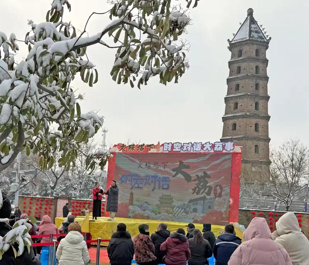 1月1日,在大荔县城文化地标文殊广场的青砖地上,群众冒着风雪严寒看大戏的场景成了一道风景线。沉浸式演艺“文殊塔下·时空对话大荔事”活动开演,同州梆子的唱腔穿透寒风,舞台上“历史人物”穿越时空,与观众共话大荔往事。同日开锣的“名角上线·好戏开锣”直播嘉年华,更是让戏迷过足了瘾——直播间里点赞刷屏,戏台前观众连连叫好,线上线下的掌声,汇成了非遗传承的新乐章。