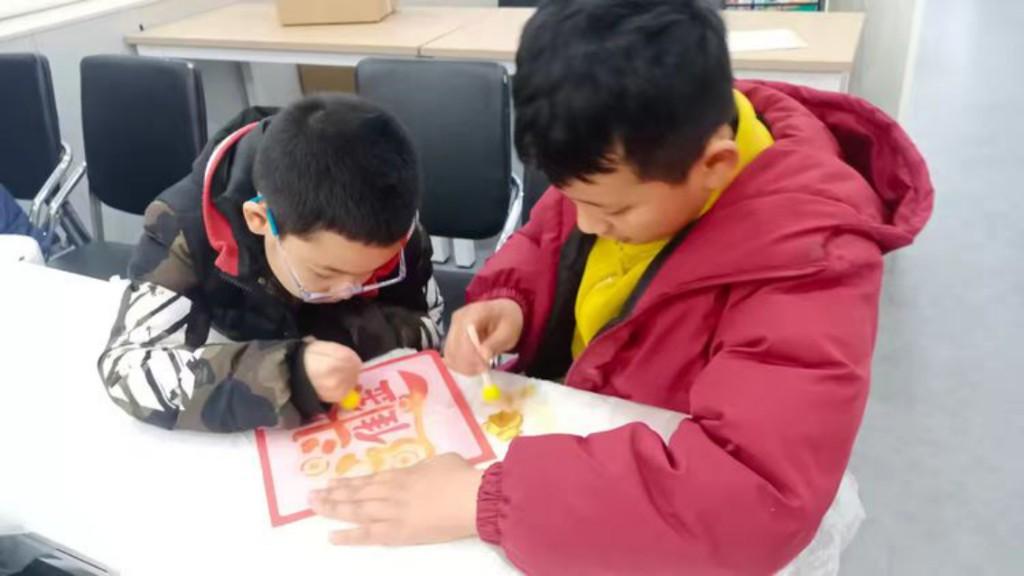 拓印实践环节热闹开启。孩子们三人一组,手持海绵刷,小心翼翼蘸取金、黑双色颜料,对准模板均匀按压。“要蘸匀才好看!”“轻一点,图案才清晰!”大家互相提醒、分享技巧。很快,一张张融合元旦喜庆与马年吉祥寓意的福字跃然纸上。不少孩子表示要把作品作为新年礼物送给邻居长辈:“我要去拜访隔壁奶奶,祝她新年快乐!”“这是我亲手做的贺礼,比买的更有意义!”