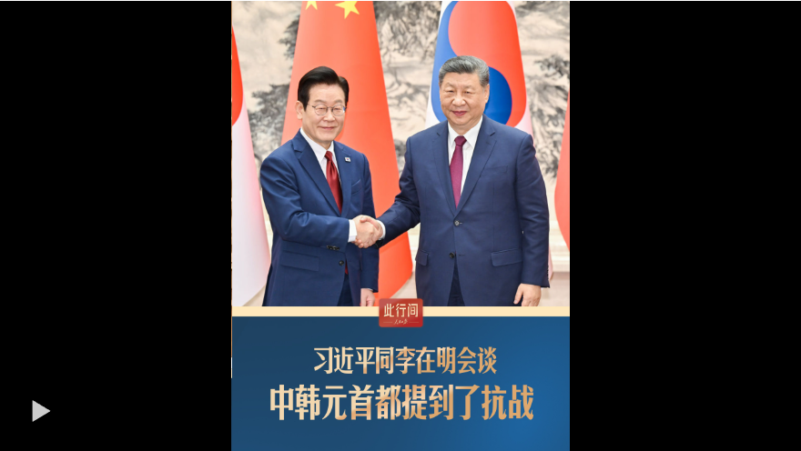 1月5日,国家主席习近平同韩国总统李在明举行会谈。习近平指出,中韩应当坚定站在历史正确一边,作出正确战略选择。会谈中,两国元首都提到了80多年前的抗战。