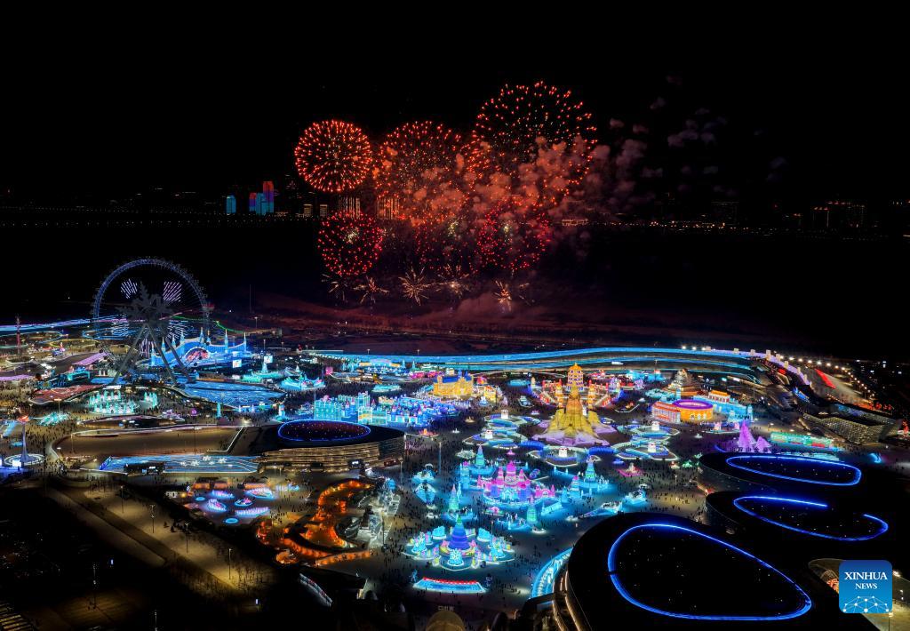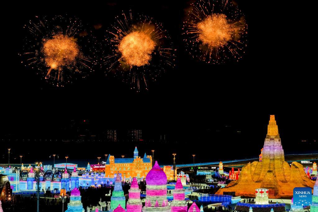 This photo taken on Jan. 5, 2026 shows a firework show at the Harbin Ice-Snow World in Harbin, northeast China's Heilongjiang Province. The 42nd Harbin International Ice and Snow Festival kicked off at the Harbin Ice-Snow World here on Monday. (Xinhua/Zhang Tao)