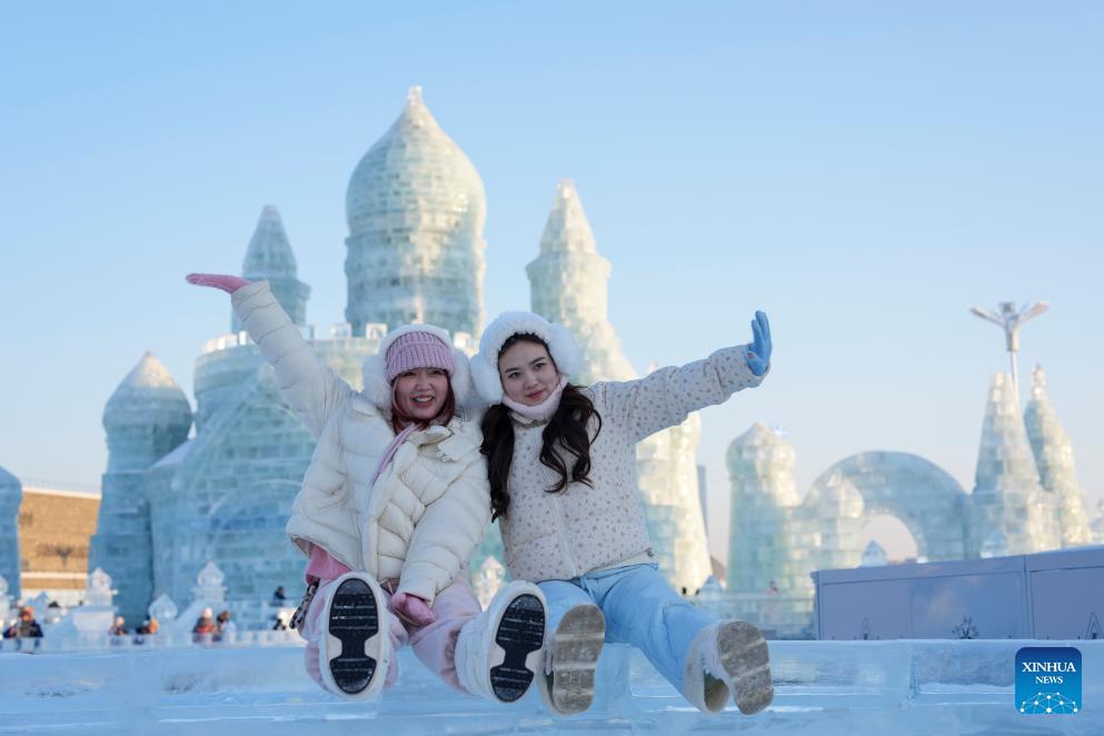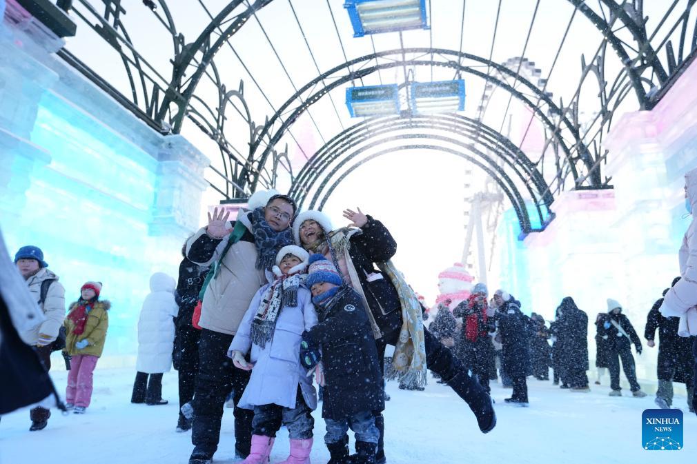 Visitors pose for photos at the Harbin Ice-Snow World in Harbin, northeast China's Heilongjiang Province, Jan. 5, 2026. The 42nd Harbin International Ice and Snow Festival kicked off at the Harbin Ice-Snow World here on Monday. (Xinhua/Wang Jianwei)