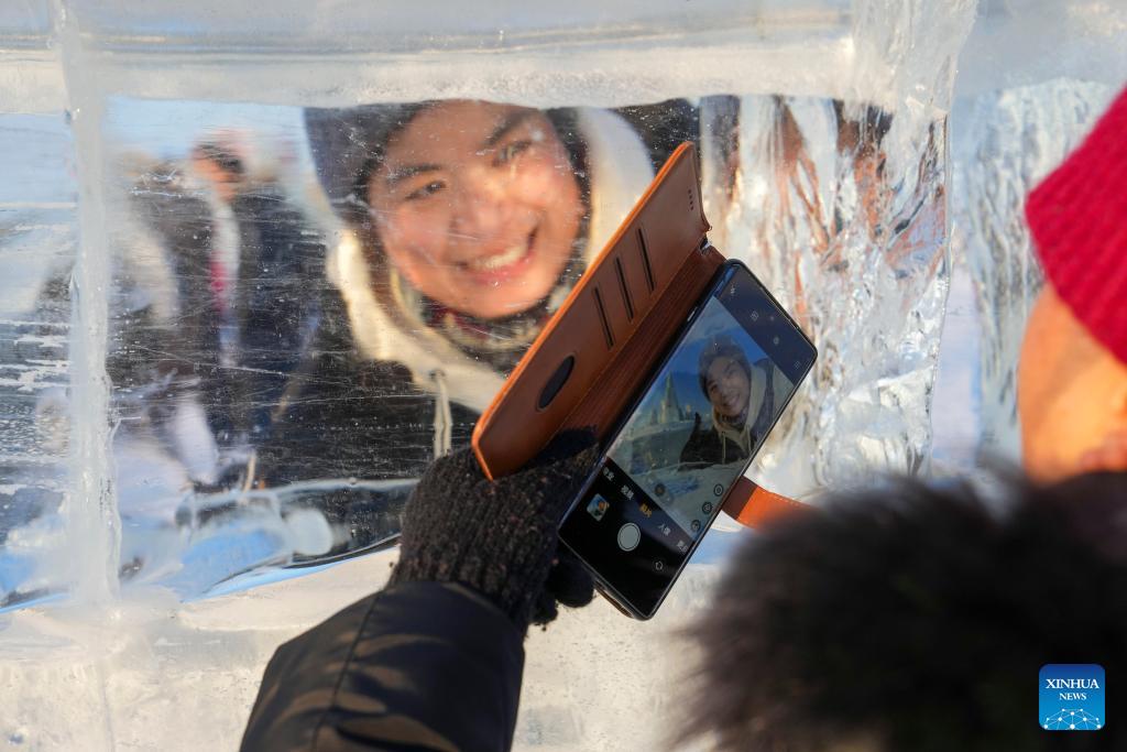 A visitor poses for photos behind an ice cube at the Harbin Ice-Snow World in Harbin, northeast China's Heilongjiang Province, Jan. 5, 2026. The 42nd Harbin International Ice and Snow Festival kicked off at the Harbin Ice-Snow World here on Monday. (Xinhua/Wang Jianwei)