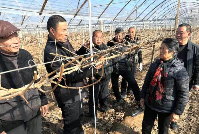 三秦都市报-三秦网讯(李世居 杨晨 记者 代泽均)1月6日,在大荔县埝桥镇白虎村的葡萄大棚里,白虎村党总支书记、葡萄种植“土专家”孙战奎在葡萄架下,手里攥着修枝剪,给围拢过来的群众指导葡萄冬季管理技术。