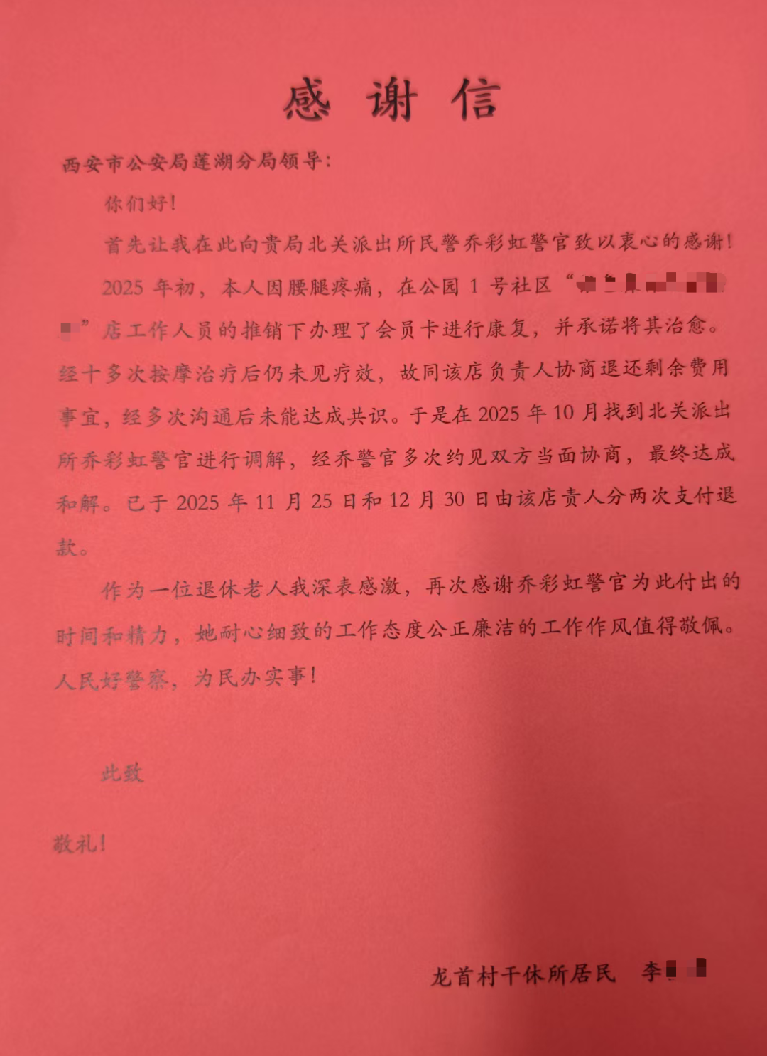 三秦都市报-三秦网讯(记者 葛兰)“太感谢乔警官了,帮我追回了养老钱,真是我们老百姓的贴心人!”近日,家住龙首村军干所的七旬老人李女士将一面写有“人民好警察、为民办实事”的锦旗和一封情真意切的感谢信送到西安市公安局莲湖分局北关派出所,紧紧握住社区民警乔彩虹的手,再三表达感激之情。这温暖的一幕,源于一场耗时数月的消费纠纷调解。