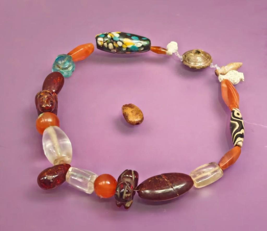 咸阳马泉汉墓出土的多宝串饰是展览中的“明星展品”。这件由琥珀、玉髓、琉璃、玉石、水晶、釉陶等6类21件小饰品组成的串饰,采用精巧的微雕工艺制成,题材丰富,寓意吉祥。它不仅是汉代贵族女性的随身饰物,更是丝绸之路开通后,中西方文化交流的实物见证。来自西域的琉璃、水晶等材质,与中原传统的玉石、釉陶工艺相互融合,成就了这件兼具装饰性与文化内涵的艺术珍品。