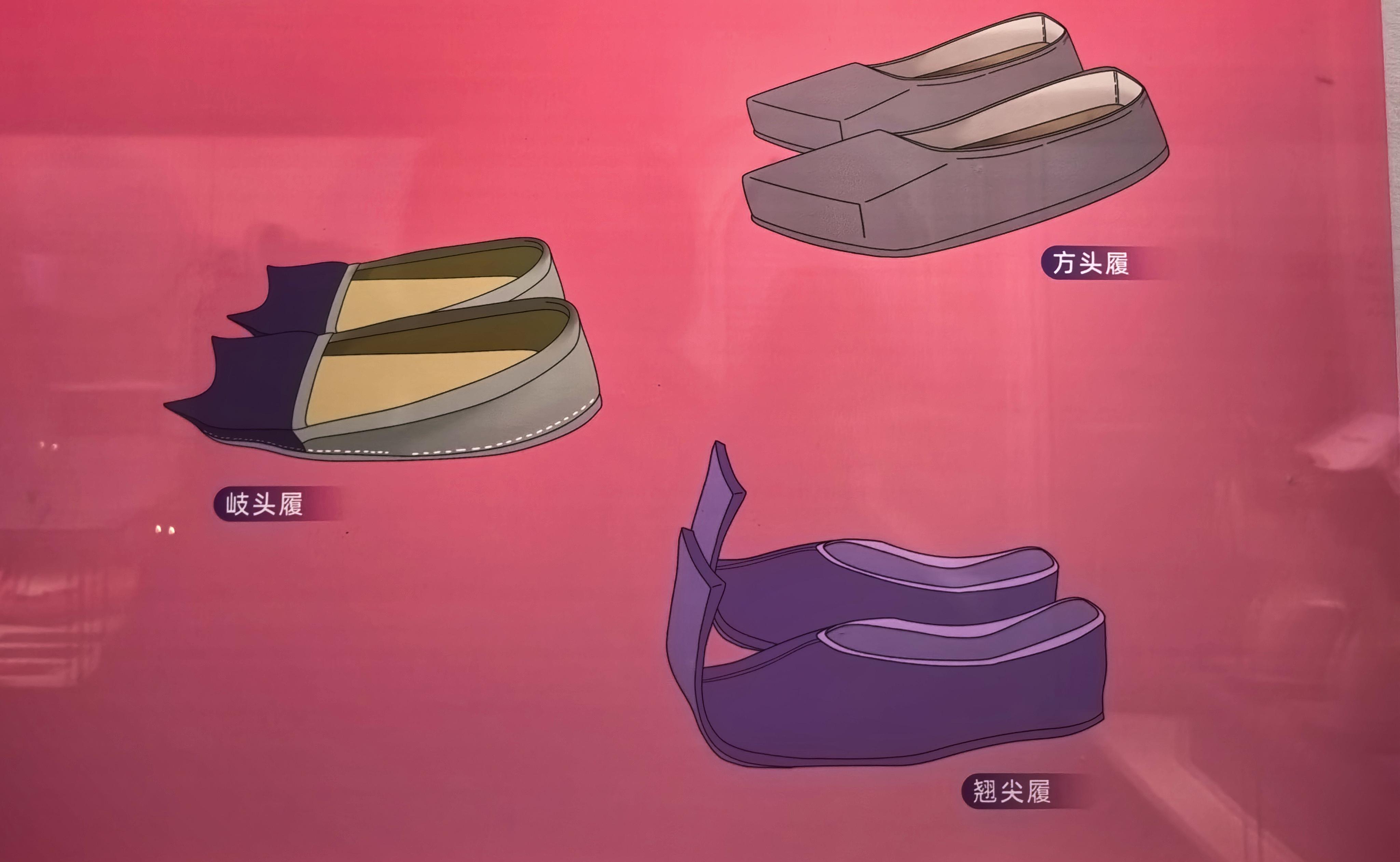 除了衣装,足服同样暗藏等级玄机。展览中展示的汉代女子足服,有方头、圆头、翘尖等多种形制。地位较低的婢女多着方头履,圆头履是西汉中晚期后流行的便装鞋履,而月牙形翘尖履则是等级较高的婢女与舞女的专属。这种双尖翘头的歧头履,堪称汉代鞋履设计的革命性创举,其高头鞋翘的设计理念,更是影响了隋唐乃至后世的女鞋款式。