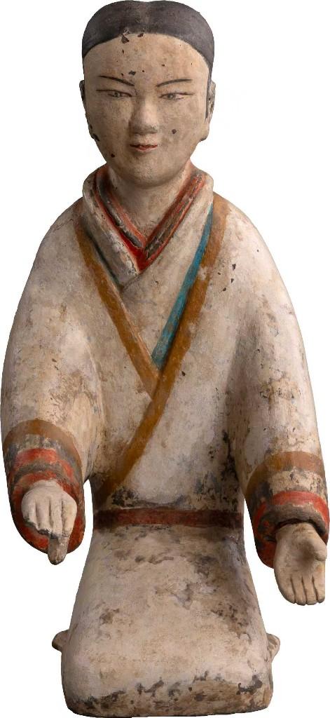 汉阳陵周应墓出土了数件塑衣式粉彩女俑,她们或坐或立,恬静优美。女俑皆梳汉初非常流行的椎髻,发髻样式为前额中分,梳至项背结髻,形似木槌,有的髻端有分臂。女俑均着多重深衣,领缘、袖袂皆有彩色锦缘,系带隐扣。女俑所系腰带较纤细,位置一般在臀部或臀部以下,显得“上长下短”。有学者认为,汉初这种“上长下短”的服饰设计并非单纯追求美观,而是与汉代礼仪规范息息相关。古人着深衣时,需双手敛于袖内,交叠置于身前,若弯腰垂肩、手置腰带处,更能凸显谦逊恭谨之态。彼时的女性服饰,便在这种“拘谨”的形制中,流露着简约素朴又含蓄低调的精神气质。