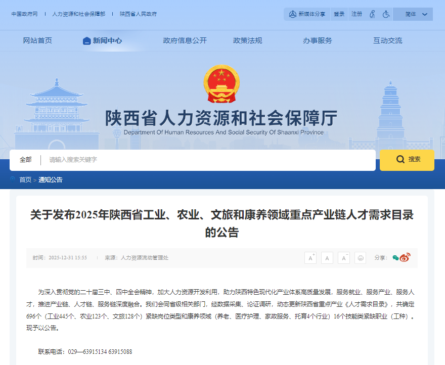 三秦都市报-三秦网讯(记者 任荣)记者获悉,日前我省发布了2025年陕西省工业、农业、文旅和康养领域重点产业链人才需求目录,共确定696个(工业445个、农业123个、文旅128个)紧缺岗位类型和康养领域(养老、医疗护理、家政服务、托育)16个技能类紧缺职业(工种)。